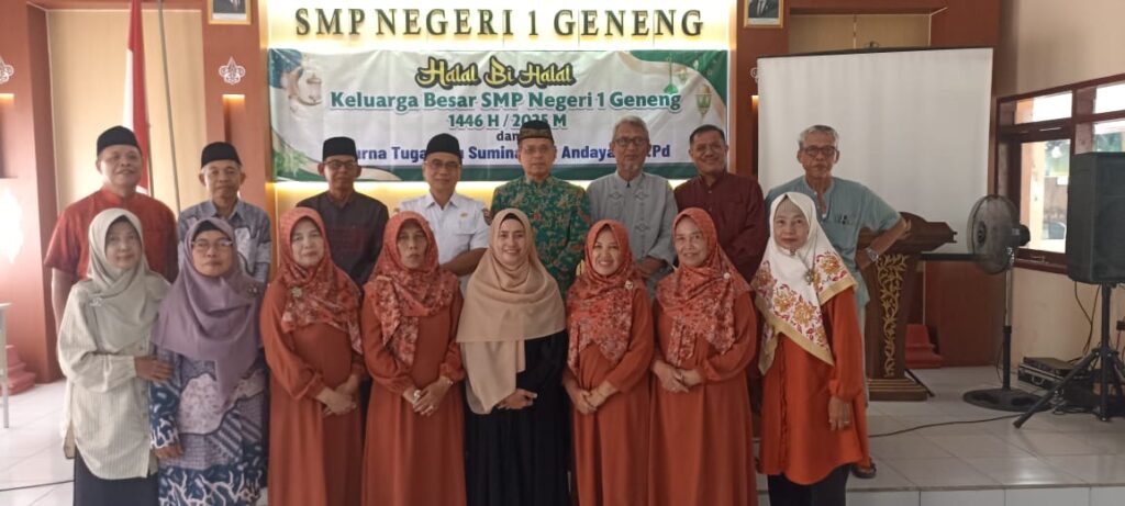 oleh sebab itu kami segenap keluarga besar SMPN 1 GENENG, mengadakan acara halal bihalal yang dilakukan disekolahan pada hari Rabu, 9 April 2025, serta di hadiri oleh bapak / ibu guru purna tugas dari SMPN 1 GENENG