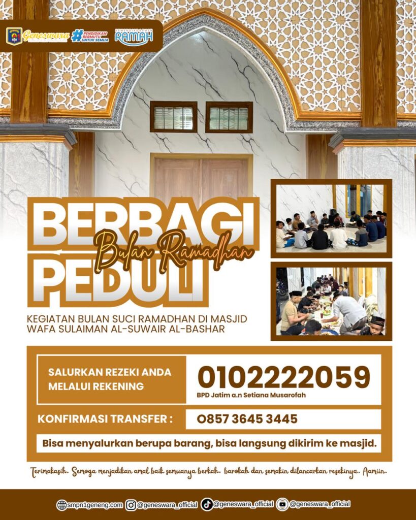 Kami Mengajak Bapak/Ibu untuk Bersedekah Guna Untuk Berbagi Kebahagian didalam Bulan Suci Ramadhan Kali ini. Bisa Berupa Uang Dengan Cara Transfer Pada Nomor Rekening Diatas dan Bisa Juga Berupa Makanan Langsung Diantarkan Kelokasi Masjid Wafa’ Sulaiman Al-Shuwair Al-Bashar, atau tepatnya di Sekolah SMP NEGERI 1 Geneng.